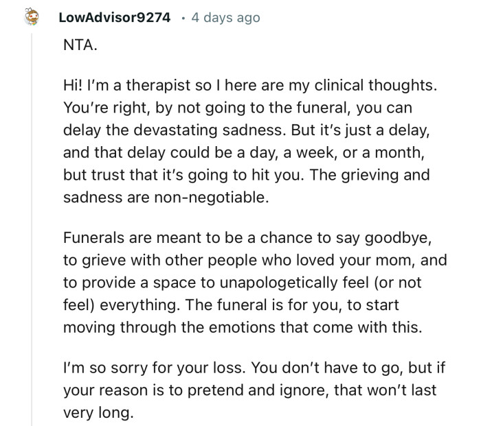 Redditors offer their heartfelt condolences but also urge OP to reconsider skipping the funeral.