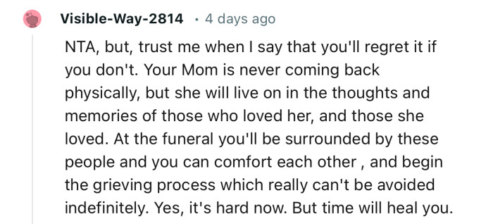 Some spoke from experience, citing how staying away won't resurrect his mother, but missing a genuine farewell might linger as a lifetime ache. A therapist even chipped in, emphasizing that delaying the sadness won't soften its blow later.
