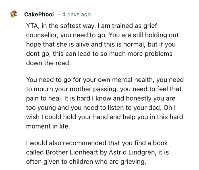 "You’re NTA. No one is. But please go. You don’t even know how it might help you."