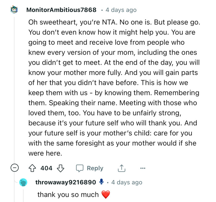 "You need to go for your own mental health; you need to mourn your mother’s passing; you need to feel that pain to heal."