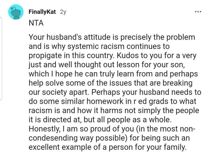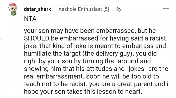 "You did right by your son by turning that around and showing him that his attitudes and 'jokes' are the real embarrassment."