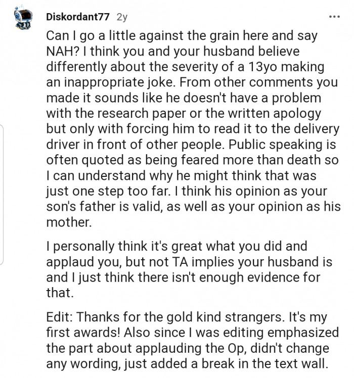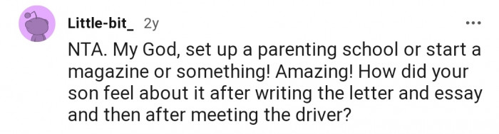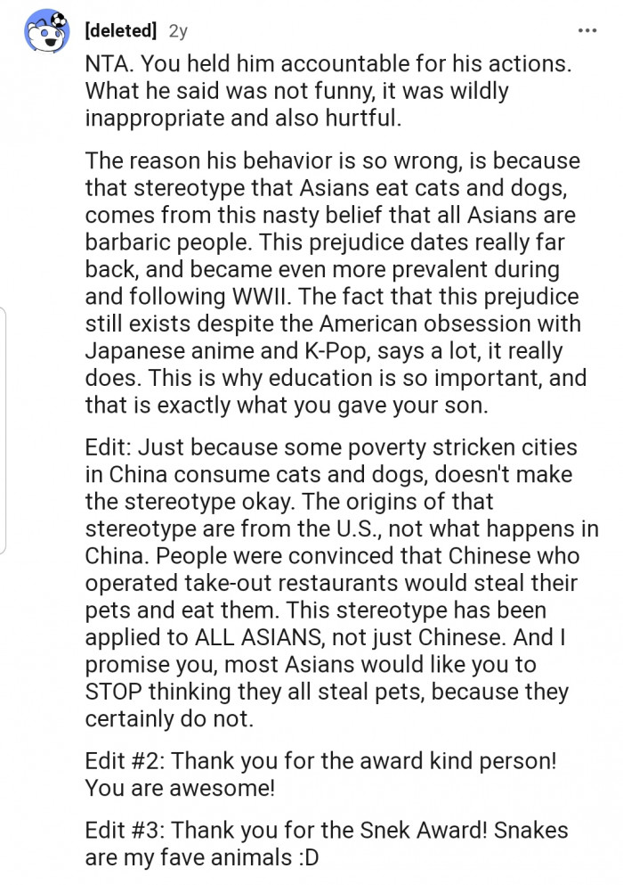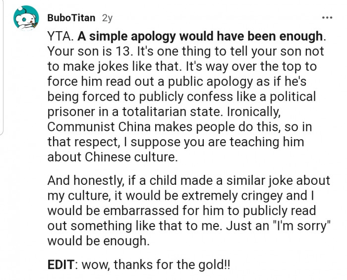 OP then forced her son to write a one-page paper on Chinese culture and an apology letter, which he had to read to the delivery driver. Interestingly, the driver appreciated the apology and decided to engage OP's son in a conversation about his daily struggles with racism.