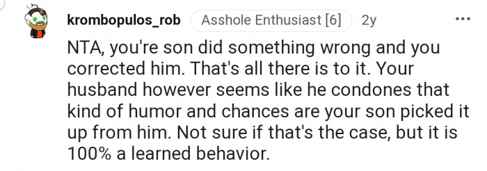 "Your husband, however, seems like he condones that kind of humor, and chances are your son picked it up from him."