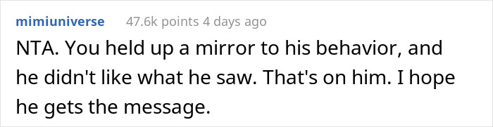 "NTA. You held up a mirror to his behavior, and he didn't like what he saw"