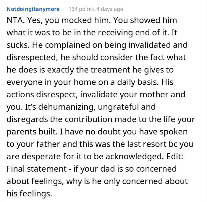 OP's dad later said that she mocked and invalidated him. Although her mother found it hilarious, she agreed that OP could have conveyed the message in a different way.