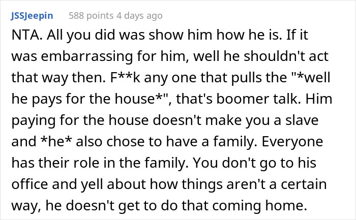 "Breadwinner doesn’t mean you get to throw your weight around as soon as you get home. A breadwinner with a SAH parent should ultimately be praising the SAH parent for continually keeping the place tidy and taking care of cooking/children"