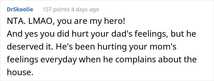 "NTA. LMAO, you are my hero! And yes, you did hurt your dad's feelings, but he deserved it"