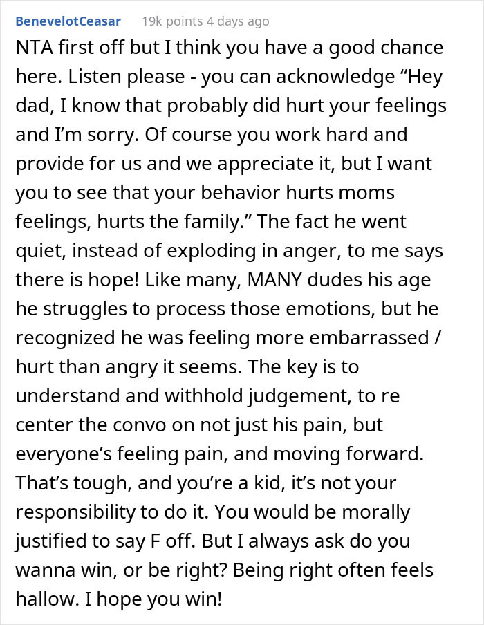 "The fact he went quiet, instead of exploding in anger, to me says there is hope! Like many, MANY dudes his age, he struggles to process those emotions, but he recognized he was feeling more embarrassed / hurt than angry, it seems"