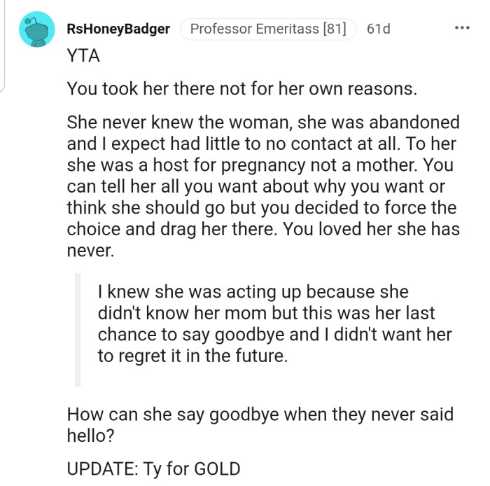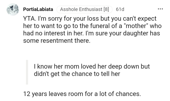 Regardless, OP was determined to organize a fitting funeral and say his final goodbye alongside his daughter. The subsequent trip to the funeral became a source of contention—why would she attend the funeral of a "mother" who abandoned her?