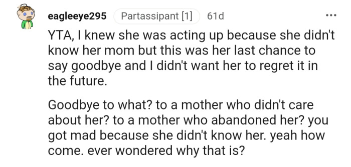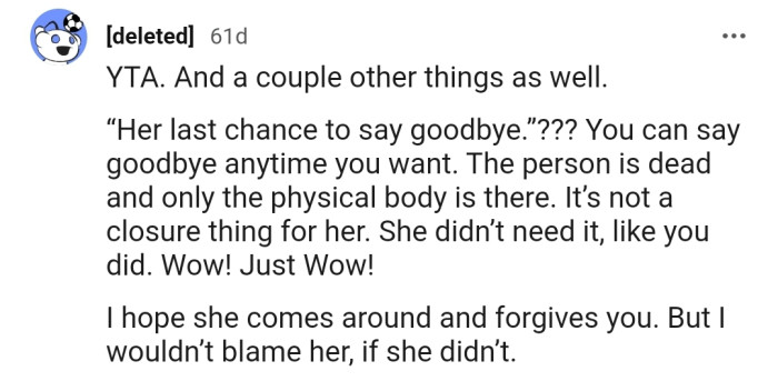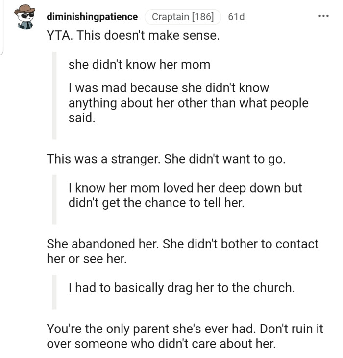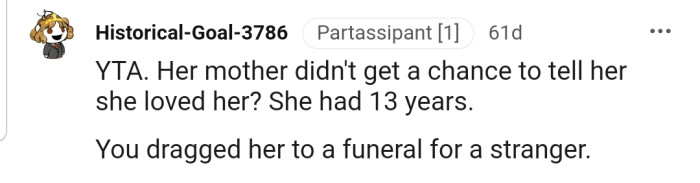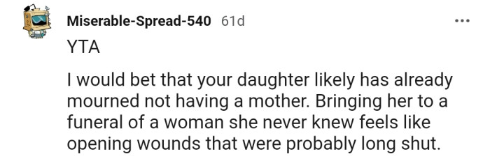 OP is really getting heat from the Reddit community. They find it absurd that he would drag his daughter to the funeral of a "deadbeat" mom.