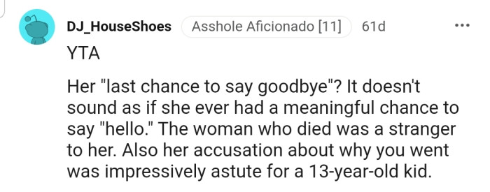 "YTA...The woman who died was a stranger to her."