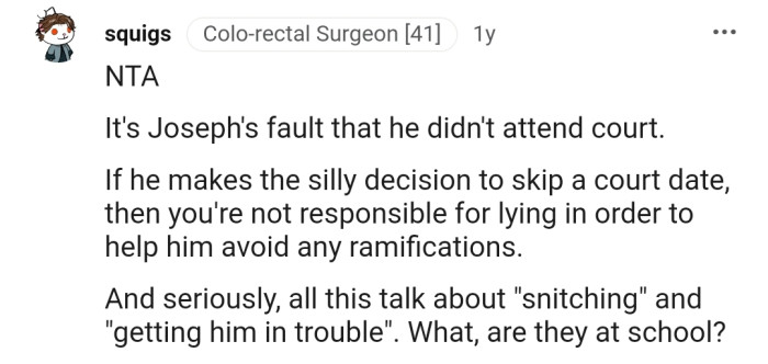 The officer remained skeptical, emphasizing the importance of respecting court attendance. Things took an unexpected turn when the officer suddenly approached OP and inquired about Joseph's whereabouts on that particular day.