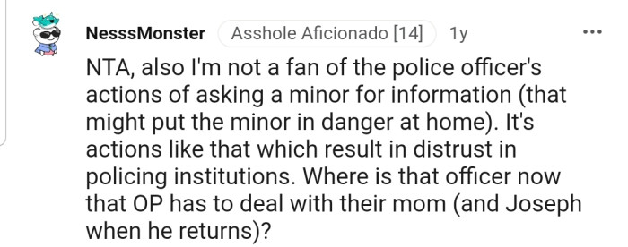 Upon returning home, OP faced his mother’s wrath. She blamed him for Joseph's predicament and labeled him a “snitch” before storming off to the police station to be with her lover.