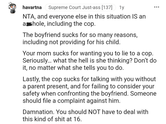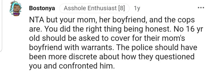 "No 16-year-old should be asked to cover for their mom's boyfriend with warrants."