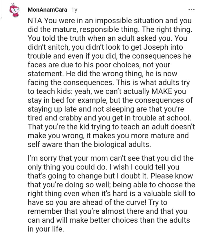 The Reddit community believes that Joseph's actions, not OP’s honesty, led to the current predicament. OP faced a difficult choice, but he should not be faulted for speaking the truth and aiding justice.