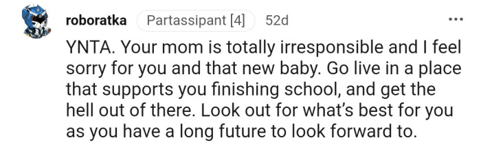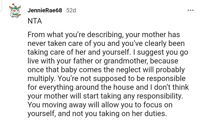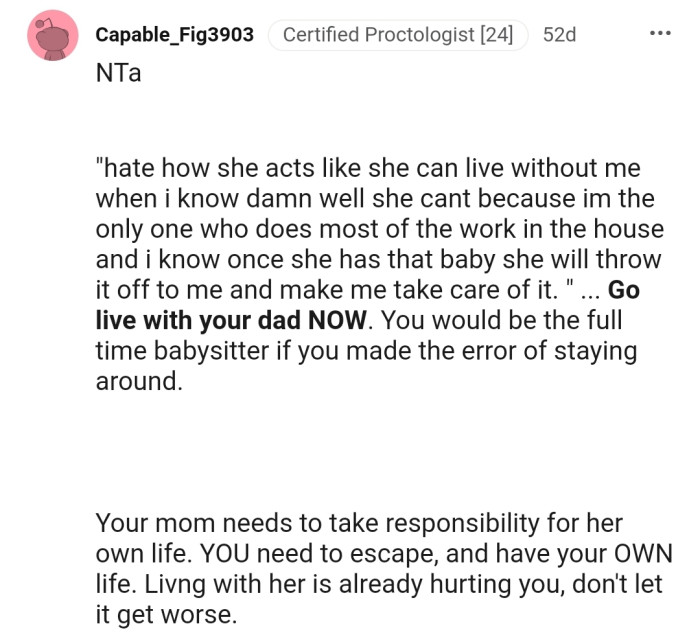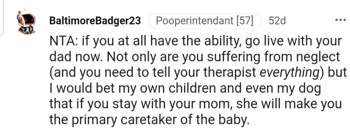 As if this isn’t enough, OP can’t shake off the fear that she will have to take on the responsibility of caring for the baby when it arrives. This was all too much for her to handle, so she threatened to go live with her dad instead.