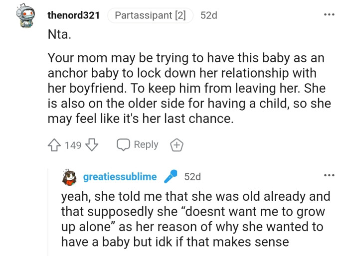 OP shared that immediately after she found out her mother was planning to have a child with her boyfriend of two months, she told her how terrible of an idea it was.