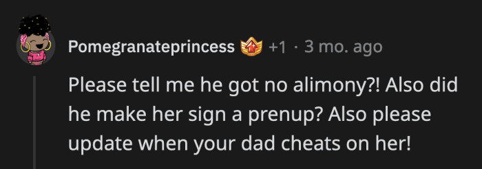 As for her dad's girlfriend and former mistress, OP and her brother never liked her rude attitude towards them. She thought the engagement gave her an advantage over OP's mom.