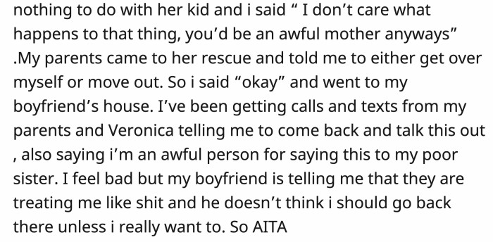 OP's boyfriend is telling her that her parents and Veronica are treating her horribly and that she shouldn't go back unless she truly wants to. OP's guilt is nagging at her, and she's doubting her hasty decision.