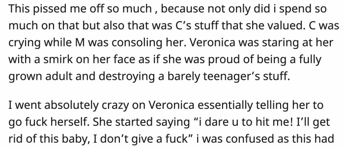 OP became furious after seeing Veronica smirking while causing so much damage, all while their young sister was crying. OP told Veronica to go f*ck herself, and the pregnant teenager retaliated.