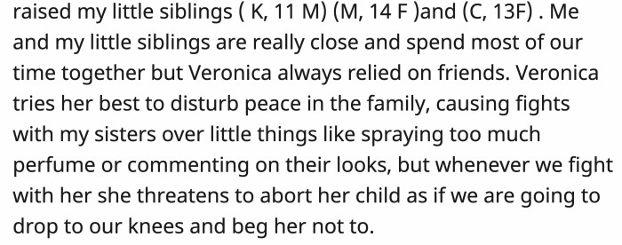Whenever the siblings tried to fight back, Veronica threatened to abort her baby, and OP's parents came to her rescue. To them, Veronica could do no wrong, citing that she's "blessing them with their first grandbaby."