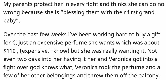 Moving on from the fight, OP began saving money to buy her 13-year-old sister a $110 perfume as a gift. Two days after OP gave it to her sister, Veronica picked a fight with the young girl.