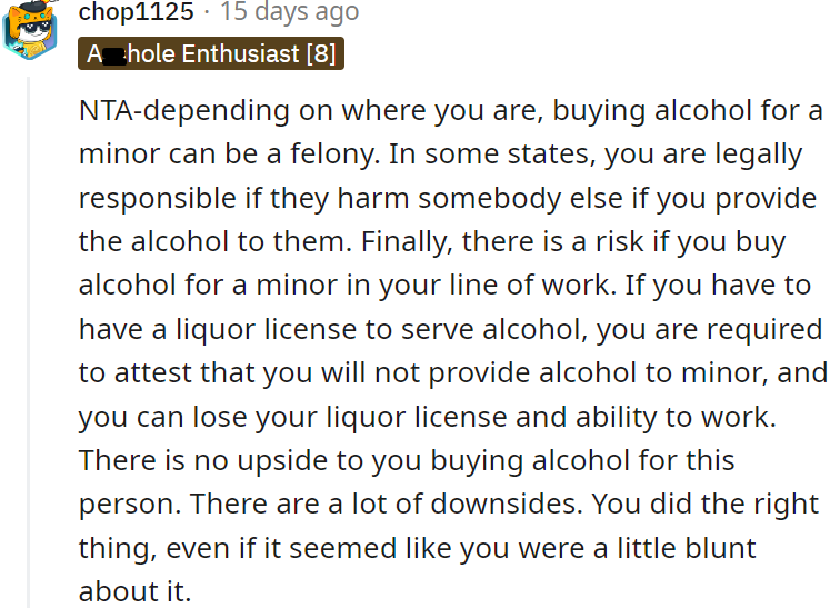 So, was OP the a***le here? According to Redditors, far from it. OP was simply a diligent bartender unwilling to compromise her principles for the sake of an underage soirée.