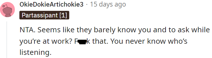 "NTA. Seems like they barely know you, and to ask while you’re at work?"