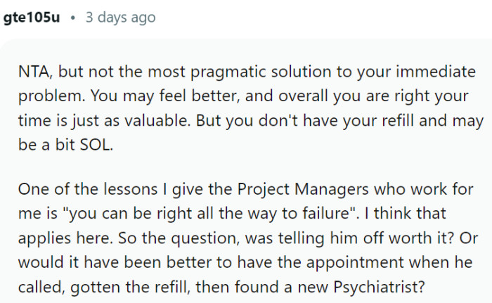 OP, although understanding, pointed out the need for a system to inform patients of such delays. This led to a defensive response from the psychiatrist, who suggested that OP could seek another doctor.