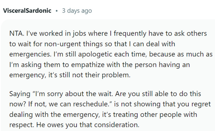 When OP called the office to reschedule, the psychiatrist called them, justifying his lateness by attending to an emergency case.