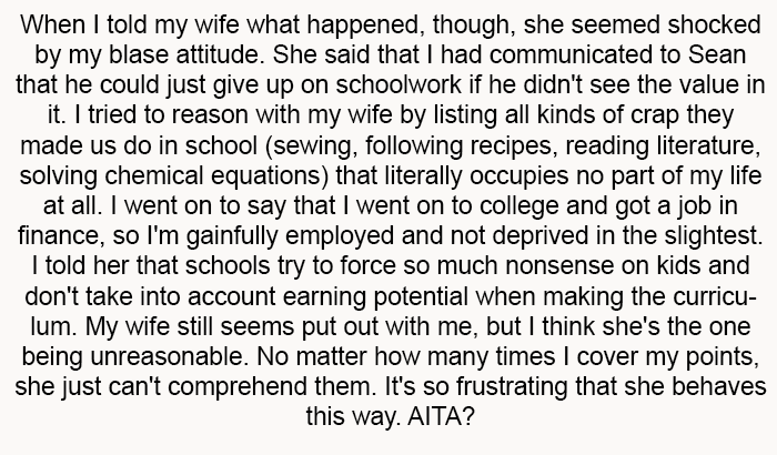 The disagreement between Sean's parents highlights a broader question about educational relevance and parental influence.