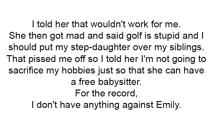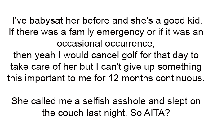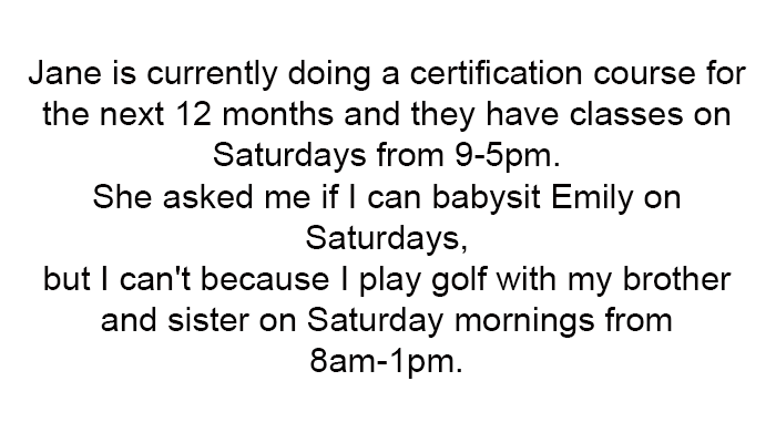 Jane, who attends classes on Saturdays, asked her husband to babysit Emily. However, he has a longstanding Saturday morning golf tradition with his siblings.