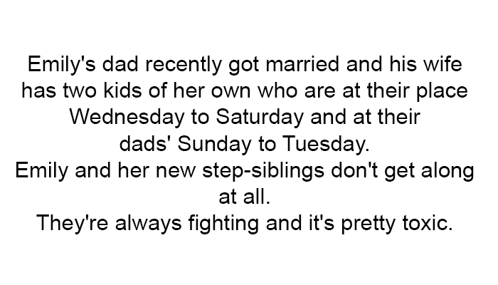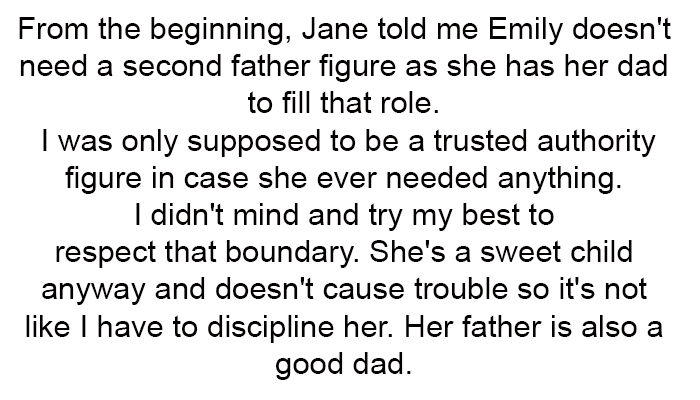 In a marriage spanning five years, the narrator (38M) and his wife Jane (34F) navigate blended family dynamics with Jane’s daughter Emily (9F). Emily splits her time between her biological parents, spending weekdays with the narrator and Jane.
