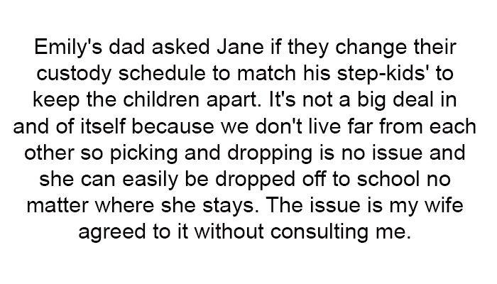 Recently, a custody schedule change was proposed to separate Emily from her new, conflicting step-siblings. Jane agreed to this change without consulting her husband, impacting their Saturday routine.