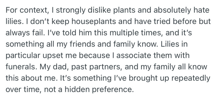 She hates plants, especially lilies. It’s not random; it’s something she has mentioned many times, and it’s tied to personal associations that make them uncomfortable for her.
