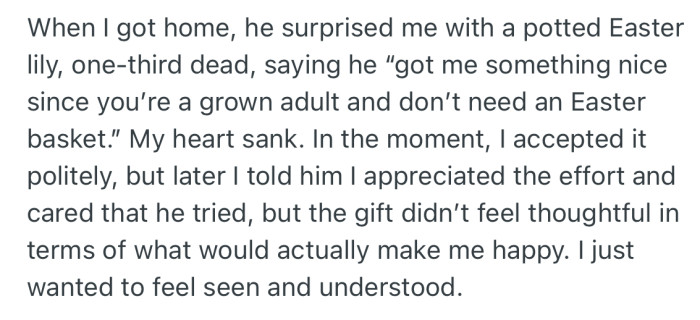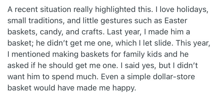 She loves simple traditions, especially around holidays. Nothing expensive, just thoughtful gestures like Easter baskets, candy, or small items that show someone paid attention. Last year, she made him a basket and didn’t receive one in return. She let it go.