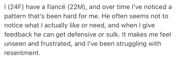 A 24-year-old woman shared that she has started noticing a pattern with her fiancé. It’s not that he never tries, but his efforts often miss what actually matters to her. When she tries to explain how she feels, the conversation doesn’t really resonate. It either turns into defensiveness or gets brushed aside, leaving her feeling more frustrated each time.
