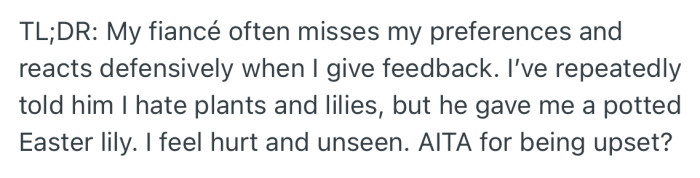 The core of this story revolves around a woman's disappointment in her fiancé's gift choice, which starkly contrasts her well-communicated preferences. So when he hands it to her, it feels less like a thoughtful gesture and more like a glaring oversight.