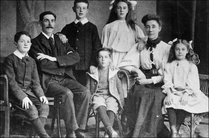 The Goodwin family; from left to right: William, Frederick Goodwin, Charles, Lilian, Augusta Goodwin, and Jessie. In the center: Harold. Sidney is not in the photo.