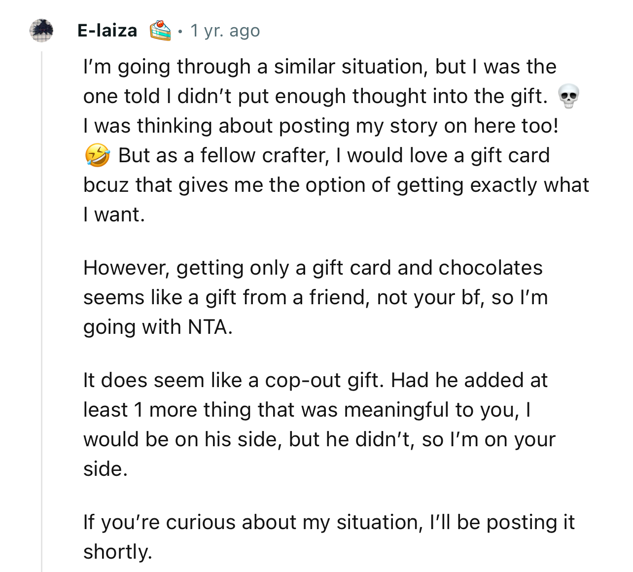 “To Me, You Are NTA Because I Think Gift Cards Are a Cop-Out Also.”