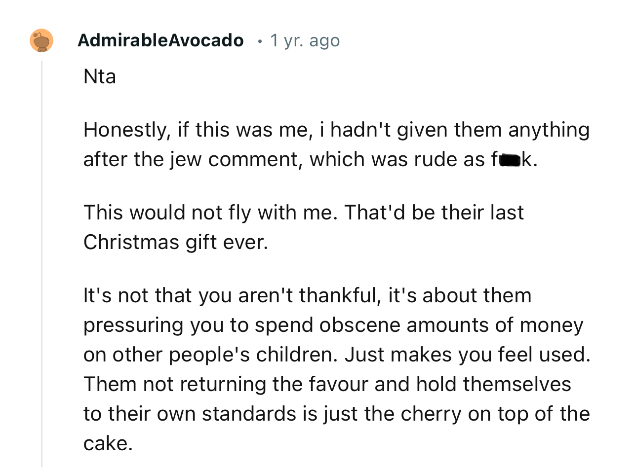 Commenters overwhelmingly supported OP, condemning her sister-in-law's family for their anti-Semitic remarks and the stark disparity in gift-giving.