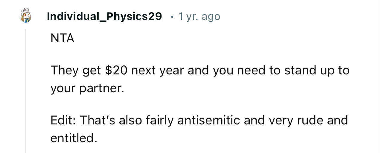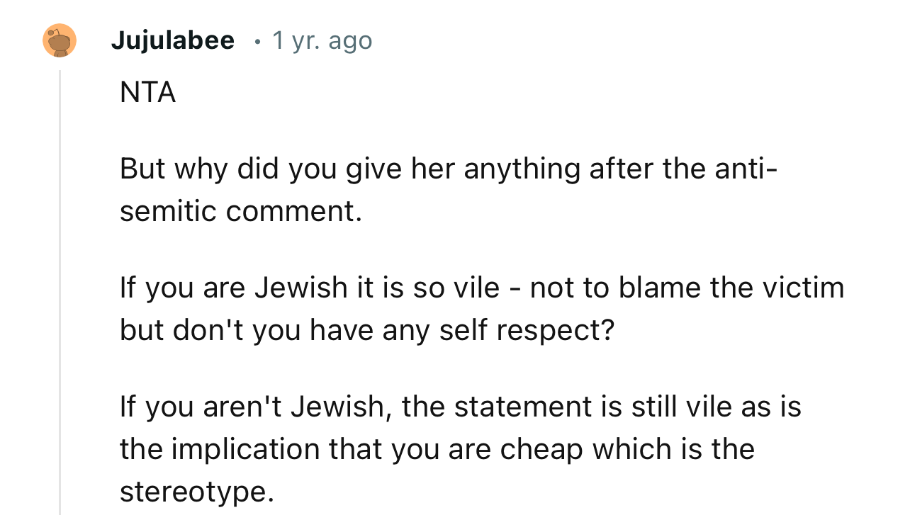 "NTA…But why did you give her anything after the anti-Semitic comment?"