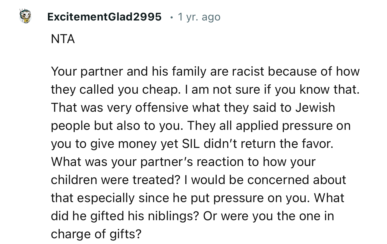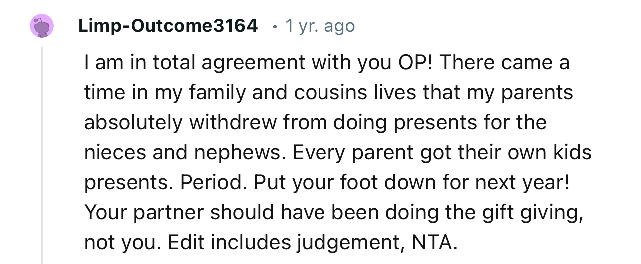 Interestingly, OP's partner had made it clear that this gift-giving wasn't going to be one-sided, meaning SIL was expected to reciprocate by giving their own kids some meaningful gifts.