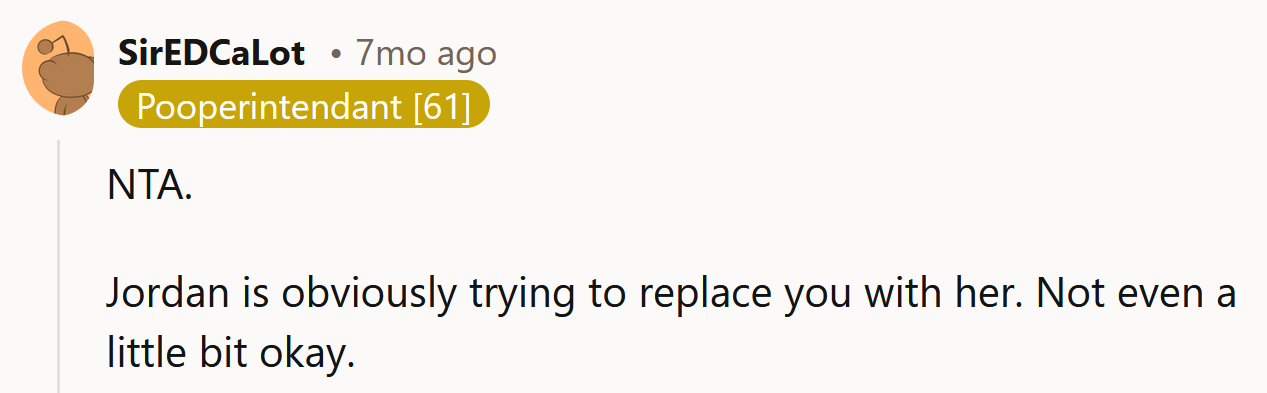 The Redditor told Adam he was welcome to stay, and Jordan called her a "boyfriend-stealing bitch." The next day, Adam texted the OP and told her she should apologize to Jordan for the "low blow."