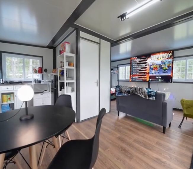 The video, shared by the Unspeakable Fans account, showcases Nathan's exploration of a small home purchased from Amazon, measuring approximately 19 feet by 20 feet. At first glance, the exterior resembles a modern garden shed, but the interior reveals a surprising amount of functionality. The space features a kitchen area on the left, complete with a dining table and chairs, demonstrating the adaptability of the compact layout.