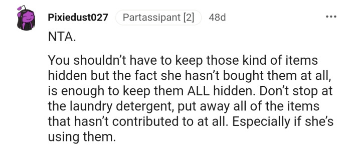 OP, now fed up with their roommate’s behavior, decided to order a new batch of detergent—but this time, for their family alone. OP even went the extra mile to stash it away in their gaming room to ensure that their roommate didn't have access.