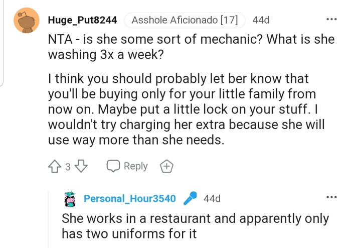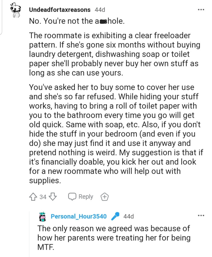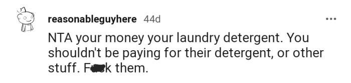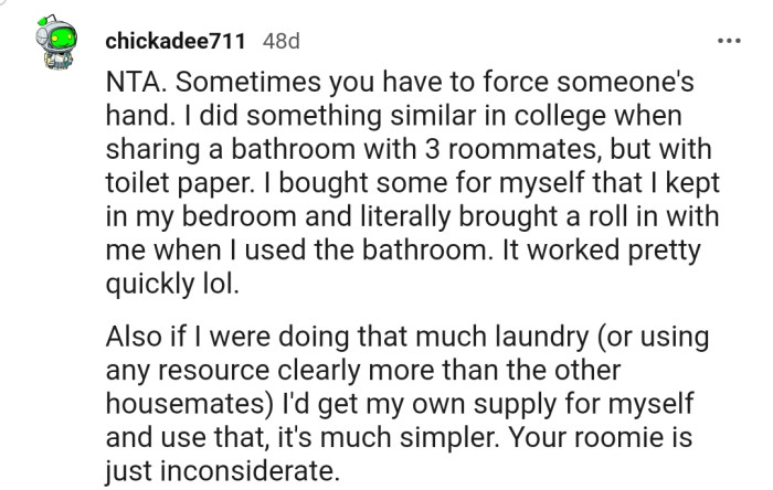 They even suggested more intense ways that OP could deal with the situation, including kicking their roommate out or locking the detergent in a box.