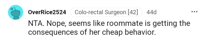 "Seems like the roommate is facing the consequences of her cheap behavior."