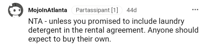 "NTA—unless you promised to include laundry detergent in the rental agreement."