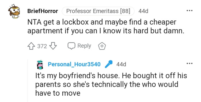 "NTA, get a lockbox and maybe find a cheaper apartment if you can."